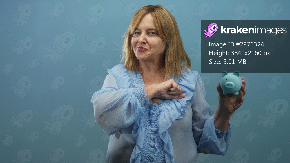 Middle aged hispanic woman holding blue piggy bank and punching forward with fist in studio; financial savings empowerment.