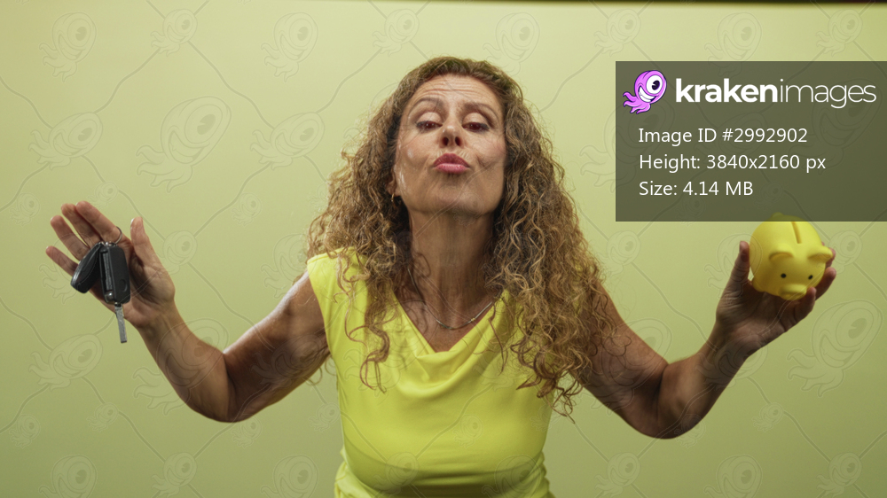 Middle aged hispanic woman holding car keys and a yellow piggy bank, bare hands raised and puckering lips in studio; financial choice playful.