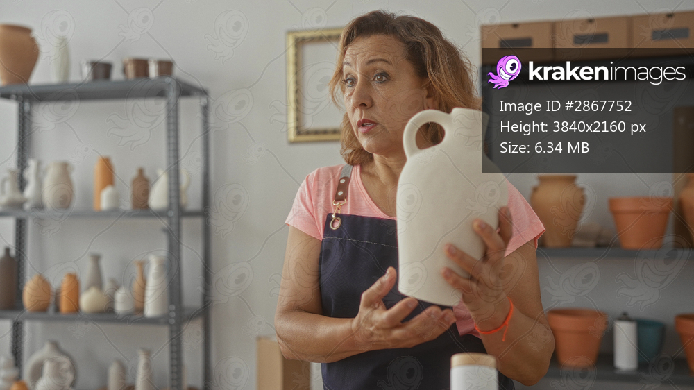 Middle aged hispanic woman holding handcrafted ceramic vase in bright artisan studio; calm focus dedication.