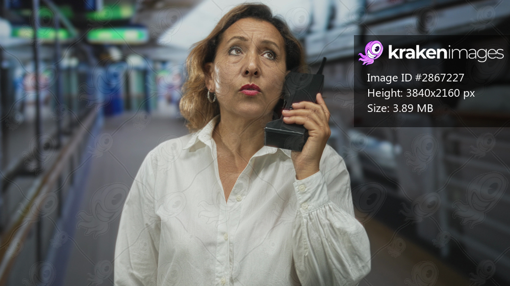 Middle aged hispanic woman holding handset to ear on cruise ship deck under bright sunlight; anticipation.
