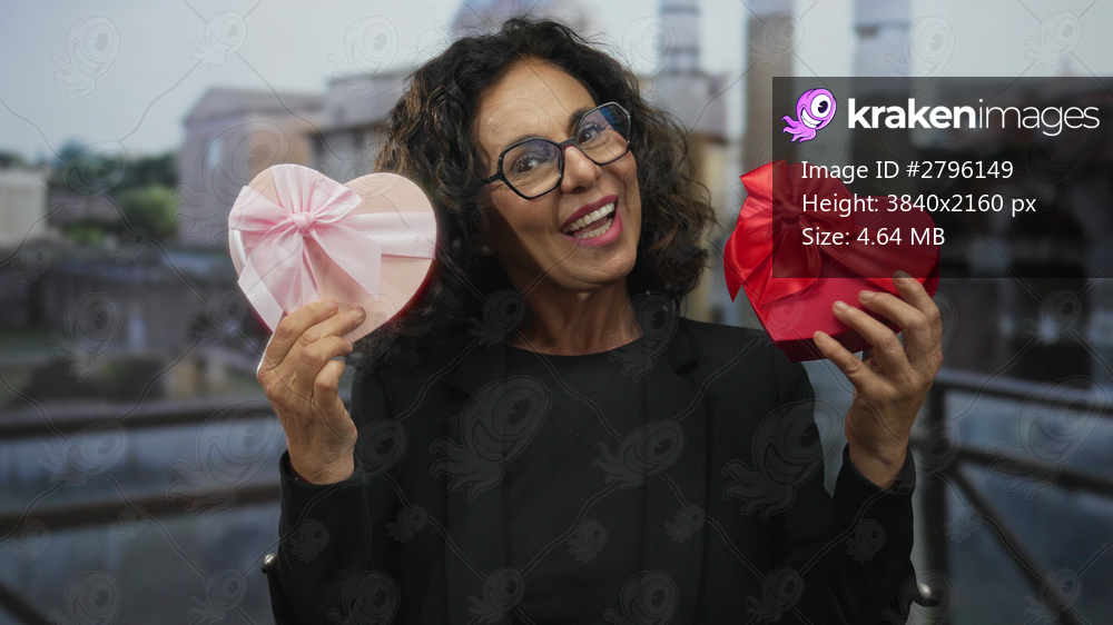 Middle-aged hispanic woman holding heart-shaped gift boxes in roman ruins, embodying joy and cultural richness outdoors.