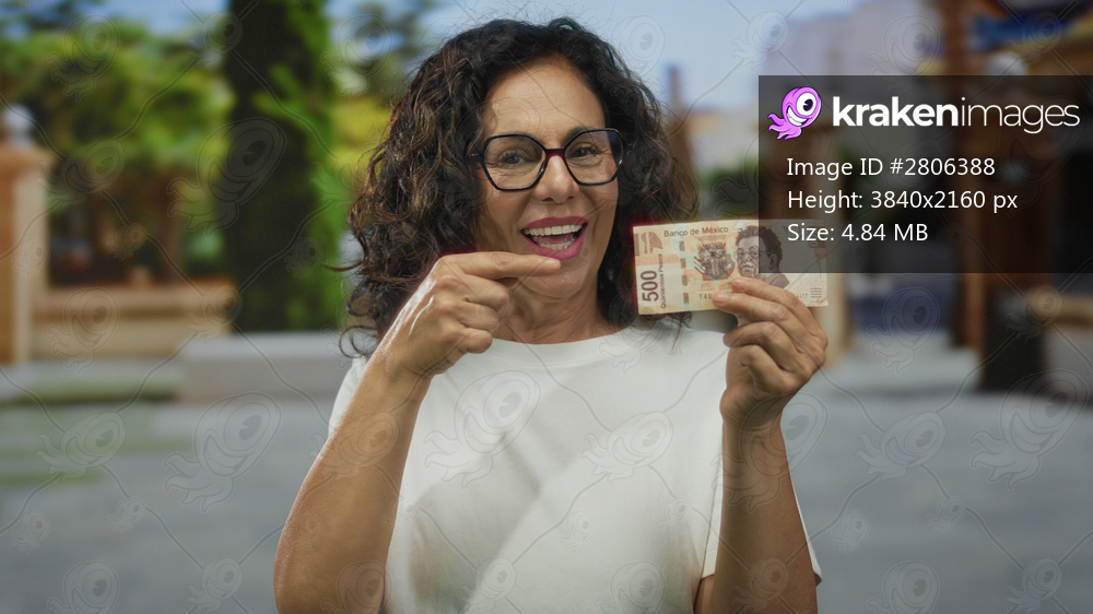 Middle-aged hispanic woman holding mexican pesos on a street outdoors, smiling and wearing glasses, highlighting financial success and happiness in an urban setting. - Kraken Images