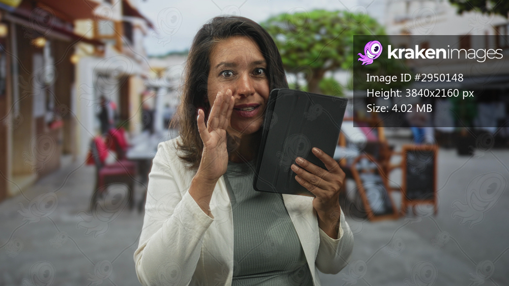 Middle aged hispanic woman holding tablet and gesturing with hand to mouth on street; digital connection engaged.
