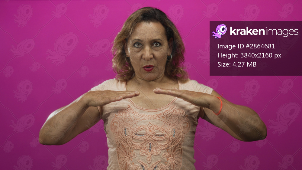 Middle aged hispanic woman holds hands parallel at chest level in a vibrant pink studio setting; serenity.