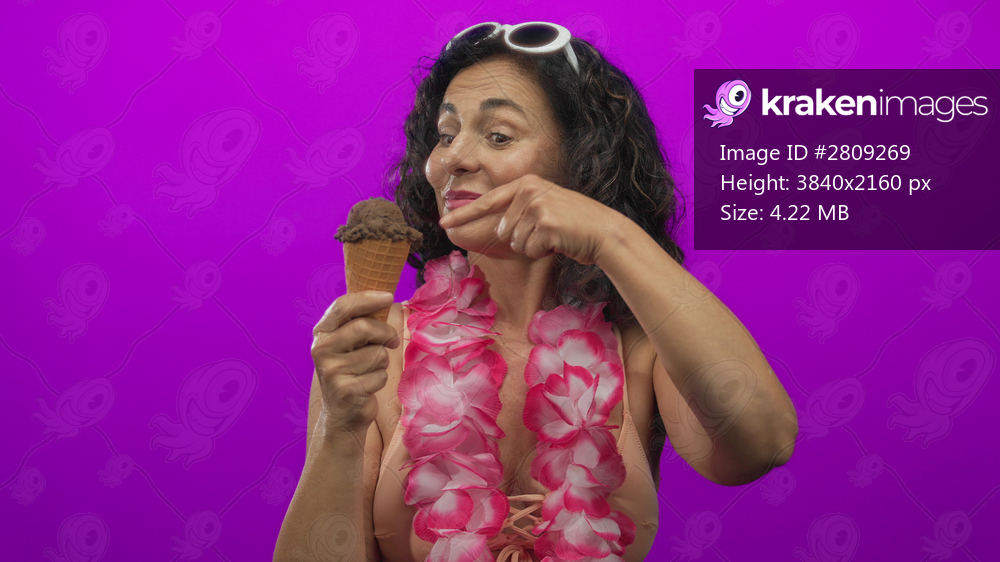 Middle aged hispanic woman holds ice cream cone and makes ok sign in studio; approval fun summer enjoyment.