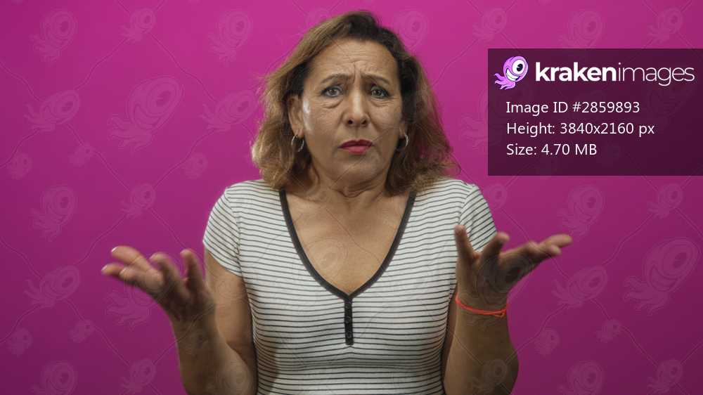 Middle aged hispanic woman holds palms up in bright pink studio with raised shoulders and questioning gesture; uncertainty.
