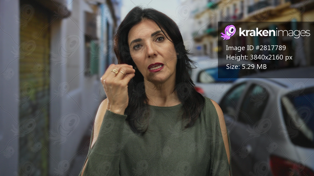 Middle aged hispanic woman holds raised hand with pinched fingers gesture on quiet city street; confusion.