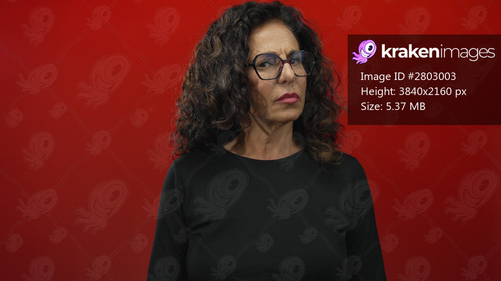 Middle aged hispanic woman holds up bare fists in a studio against a red wall; defiance determination strength.
