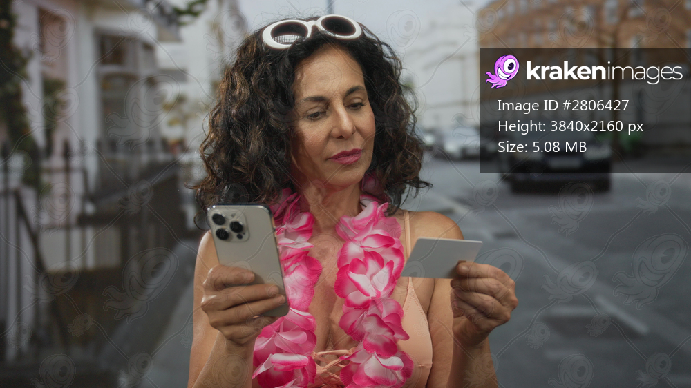 Middle-aged hispanic woman in a bikini with a hawaiian lei holds a smartphone and credit card standing on a street, capturing a blend of leisure and digital life. - Kraken Images