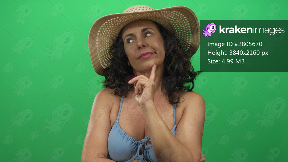 Middle-aged hispanic woman in a bikini and sunhat stands against a green background wall in thoughtful pose, highlighting a calm summer leisure vibe.