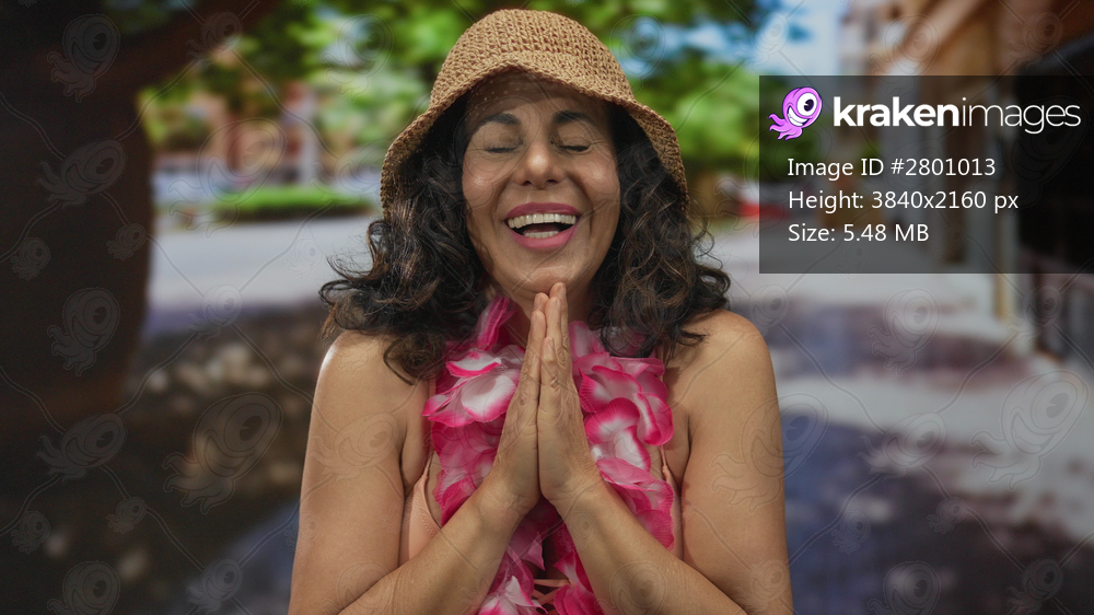 Middle-aged hispanic woman in bikini with lei and hat smiling outdoors on a sunny street promenade.