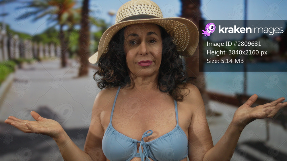 Middle-aged hispanic woman in bikini on seaside promenade, wearing sunhat, captures relaxed beach ambiance outdoors with palm trees and sunny weather.