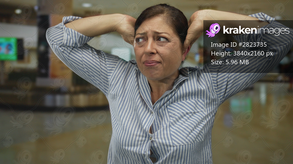 Middle aged hispanic woman in blue striped shirt covers her ears at airport terminal with tense expression; discomfort.
