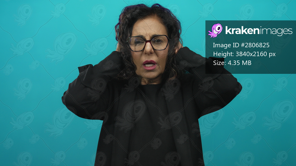 Middle-aged hispanic woman in glasses covers ears with hands against isolated green background, expressing stress or frustration while standing in front of a vivid wall. - Kraken Images