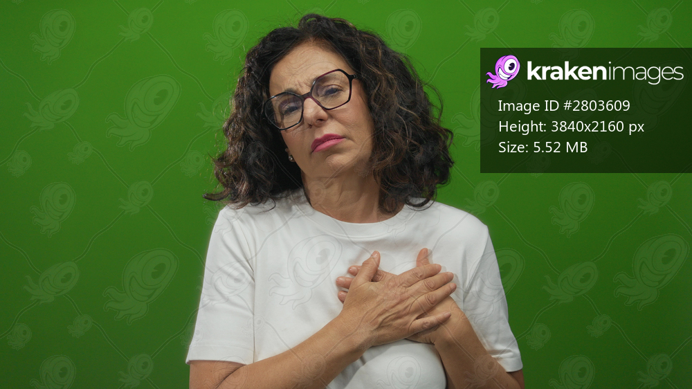 Middle-aged hispanic woman in glasses holding chest with hands against an isolated green wall background, conveying emotion and introspection.
