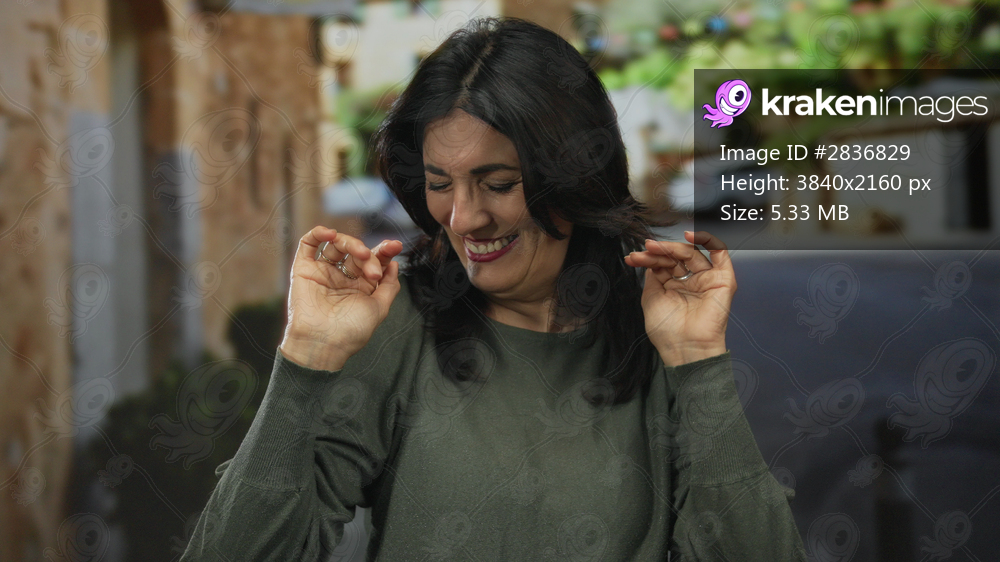 Middle aged hispanic woman in olive top makes rejection gesture with hands on the cobblestone street of an old town; denial.