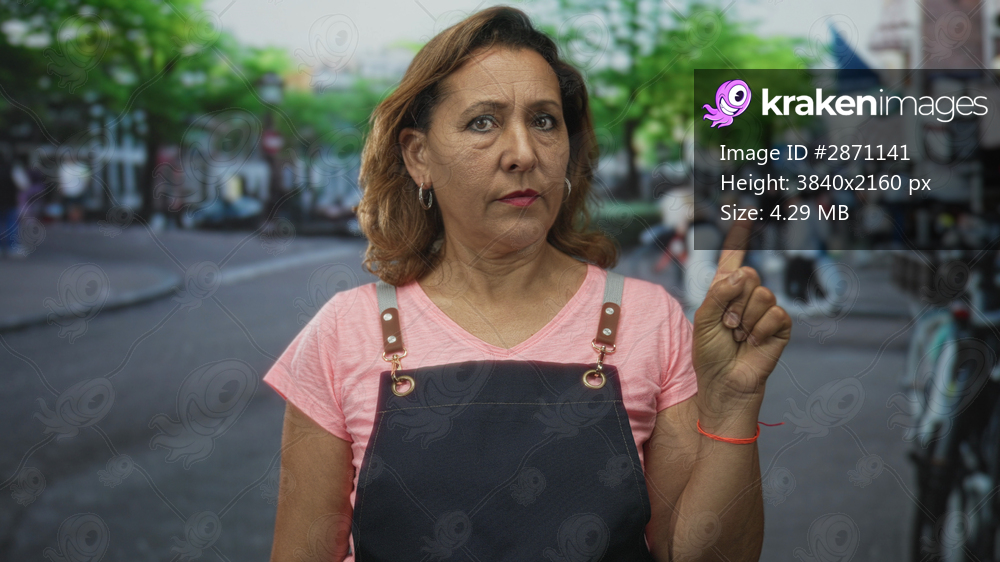 Middle aged hispanic woman in pink shirt points finger on bustling city street lined with cafes and bicycles; confidence.