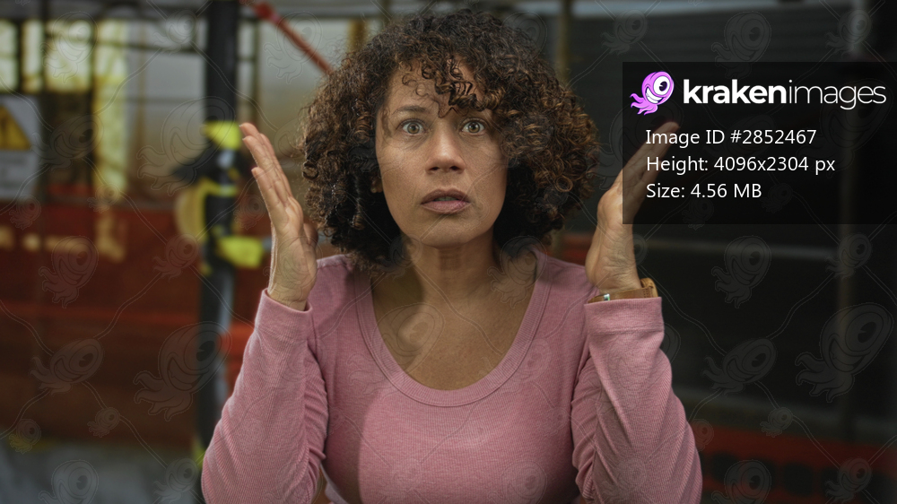 Middle aged hispanic woman in pink shirt raises hands near face with eyes wide at building; frustration uncertainty.