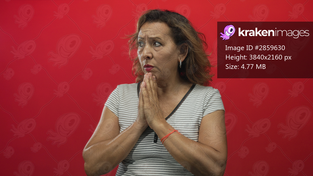Middle aged hispanic woman in striped shirt with clasped hands and worried expression in red studio; concern.