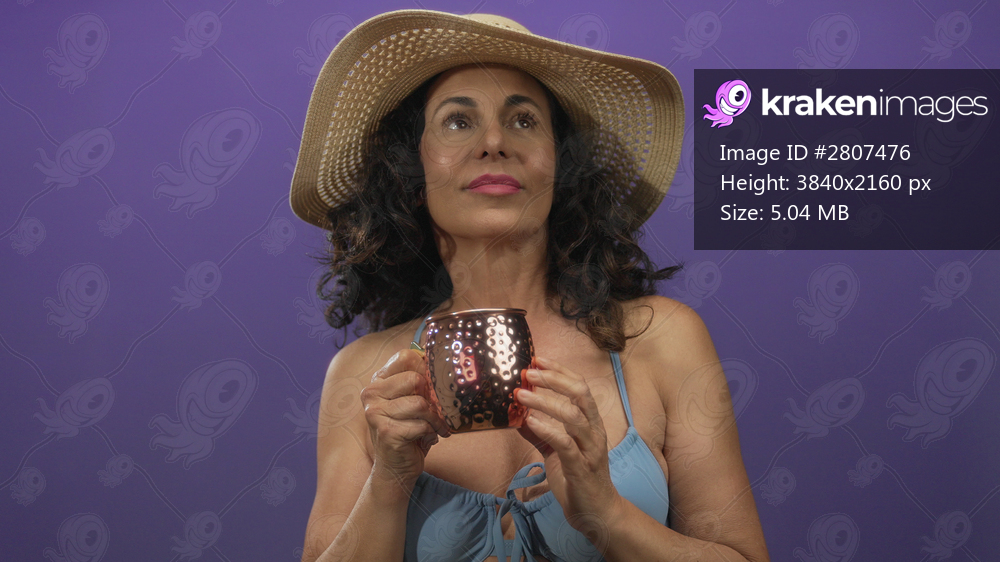 Middle-aged hispanic woman in swimsuit and sunhat holding a copper mug against a purple background, exuding a relaxed summer vibe.