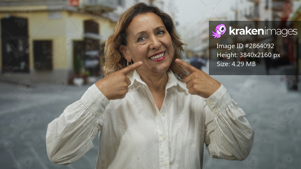 Middle aged hispanic woman in white blouse points finger to smiling lips in narrow city street; boost confidence.