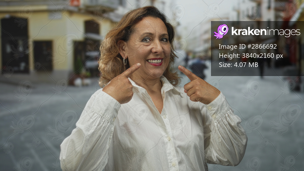 Middle aged hispanic woman in white blouse points finger to smiling lips in narrow city street; boost confidence.
