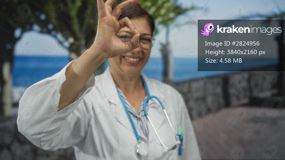 Middle aged hispanic woman in white coat with stethoscope makes ok sign with hand on street; confidence.