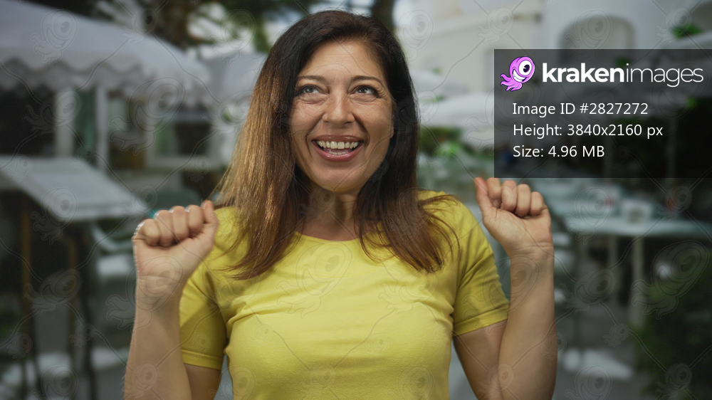 Middle aged hispanic woman in yellow shirt clenches fists and smiles broadly on street outdoors; happiness.