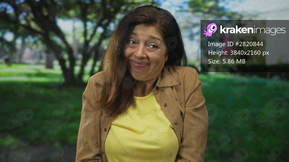Middle aged hispanic woman in yellow shirt smiles softly revealing facial wrinkles in green forest; contentment.