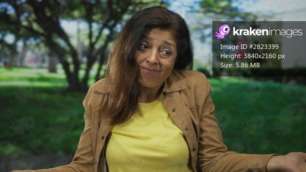 Middle aged hispanic woman in yellow shirt smiles softly revealing facial wrinkles in green forest; contentment.