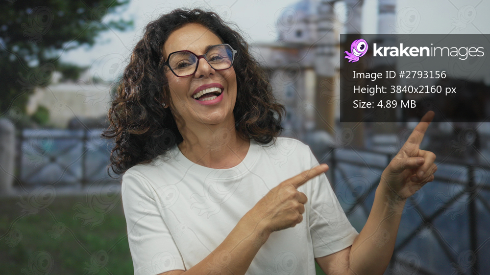 Middle-aged hispanic woman laughing and pointing outdoors at roman ruins, encapsulating the joy of travel and exploration.