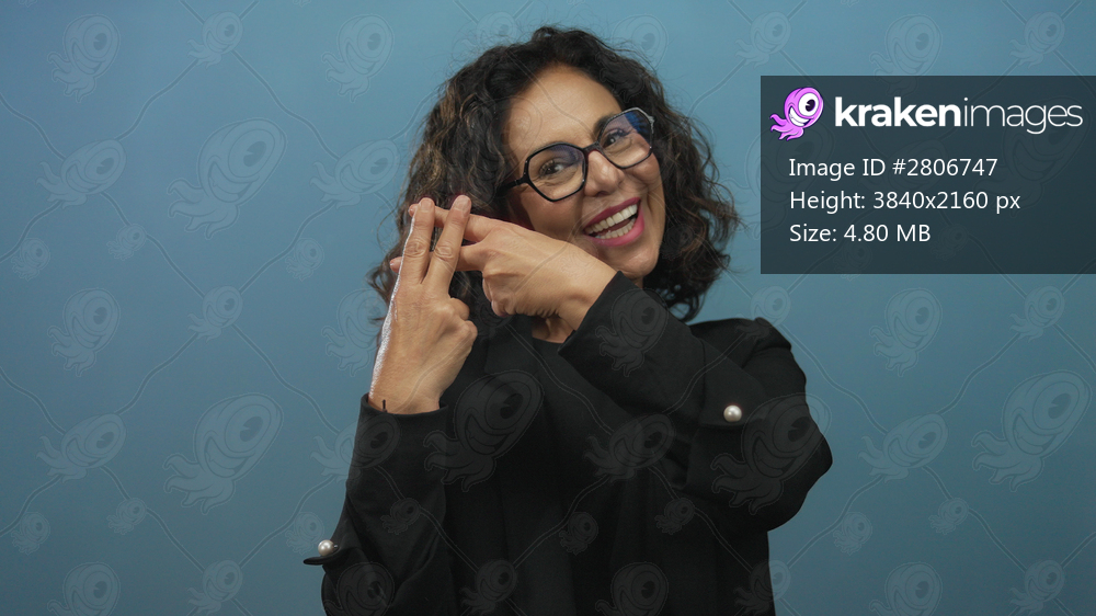 Middle aged hispanic woman makes hashtag sign with fingers against blue studio wall; social media trend connection.