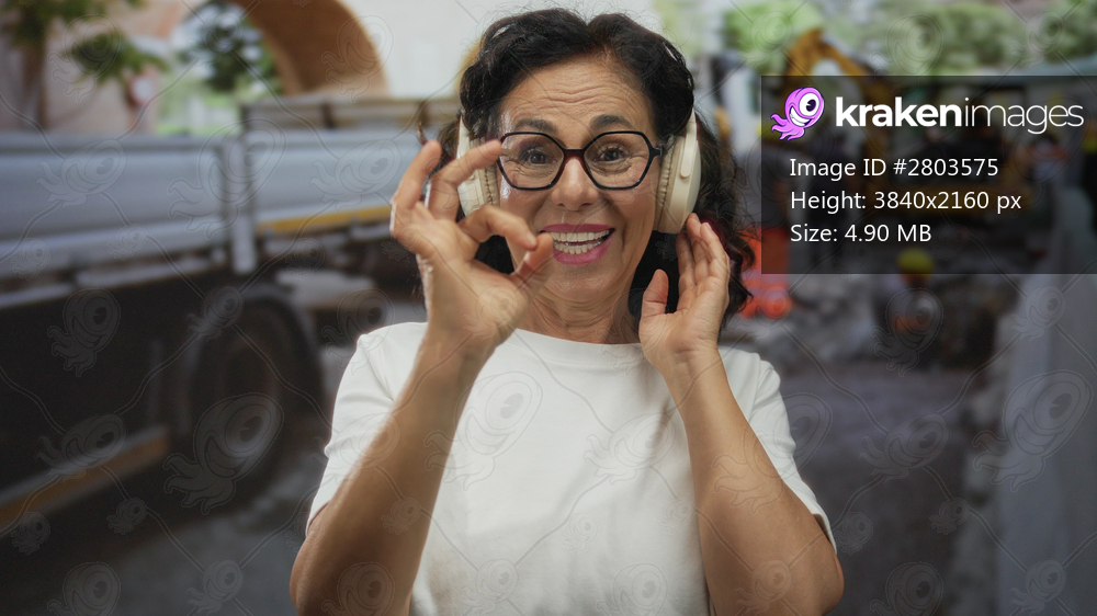 Middle aged hispanic woman makes ok gesture with her hand at outdoor construction site; positivity approval confidence optimism.