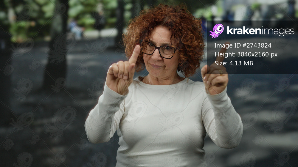 Middle-aged hispanic woman making stop gesture with fingers on a bustling city street, wearing white shirt, curly hair contrasting with outdoor urban background. - Kraken Images