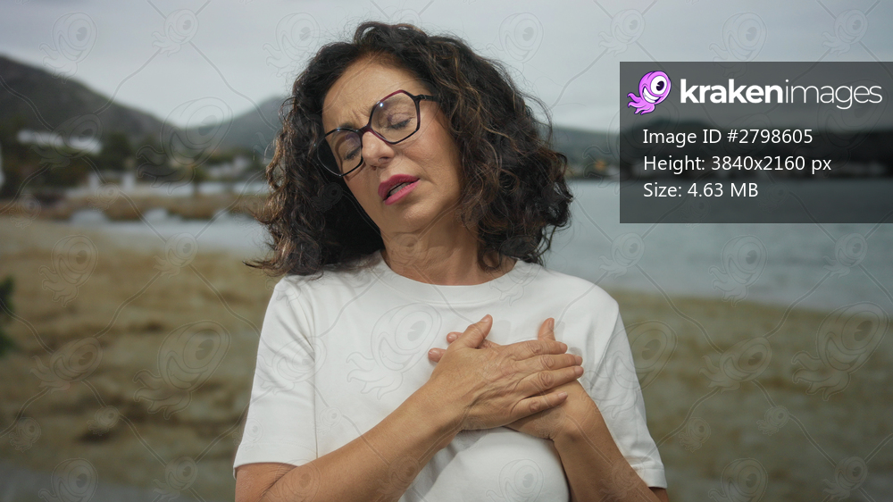 Middle-aged hispanic woman on sandy seaside in white shirt expresses emotion with hands clasped, set against a serene outdoor beach backdrop.