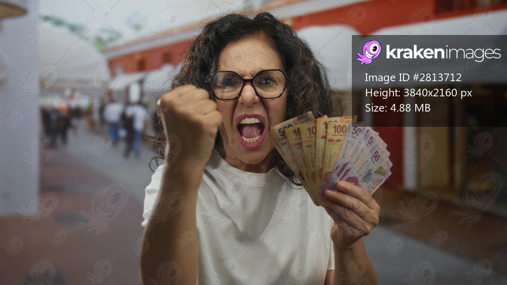 Middle-aged hispanic woman on street holding mexican pesos banknotes with expression of excitement outdoors in vibrant setting.