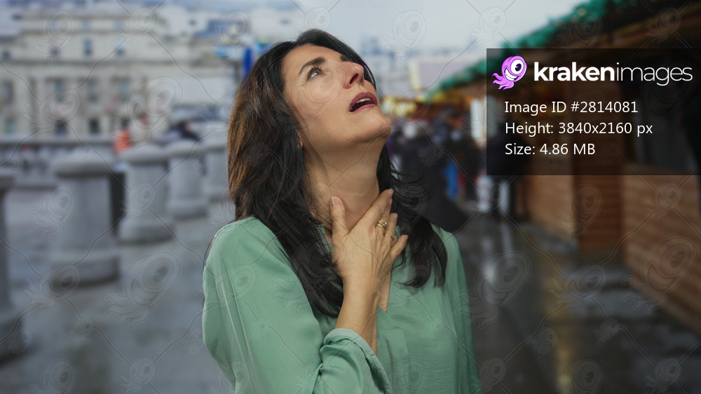 Middle aged hispanic woman pinches nose near souvenir stall at crowded city street market; disgust discomfort.