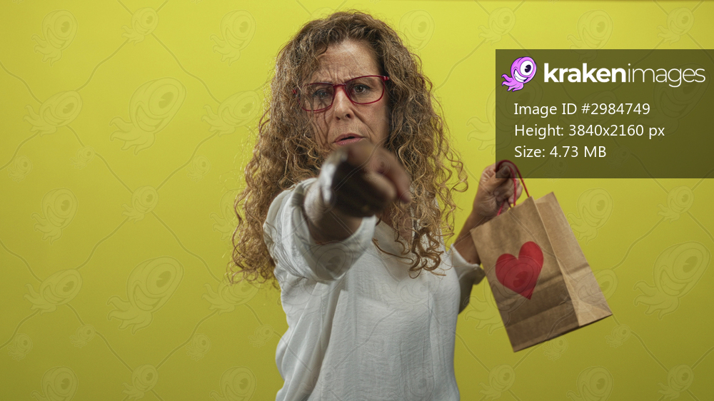 Middle aged hispanic woman pointing finger holding paper gift bag with red heart in studio; accusation urgency.