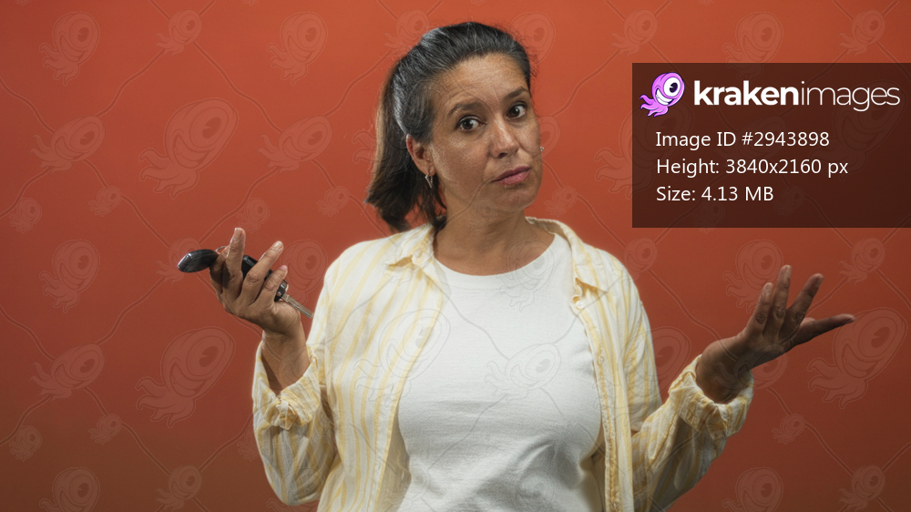 Middle aged hispanic woman points finger at viewer while holding a car key fob in a studio with orange backdrop; serious warning.