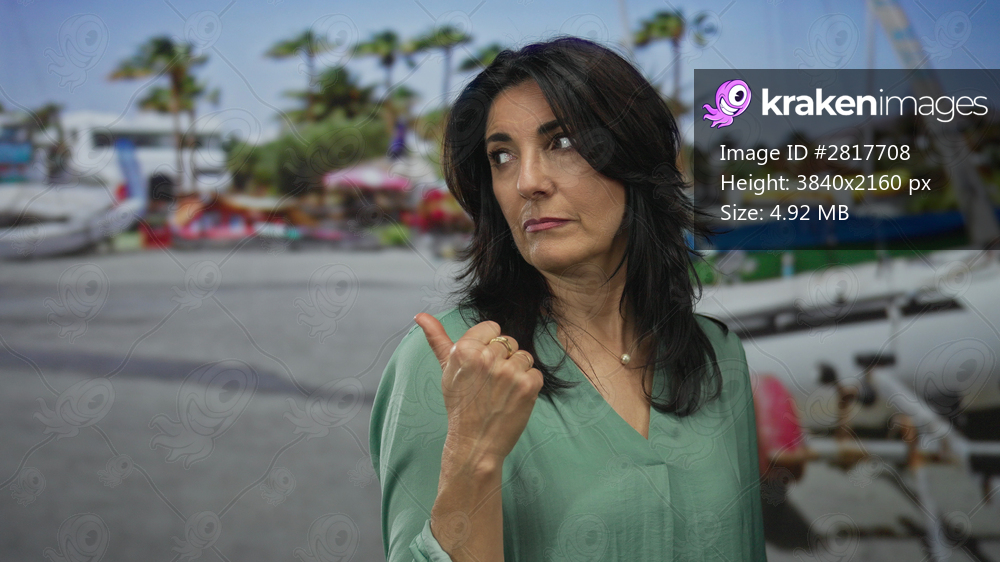 Middle aged hispanic woman points thumb to boat at port with sailboats and palm trees behind her; doubt.