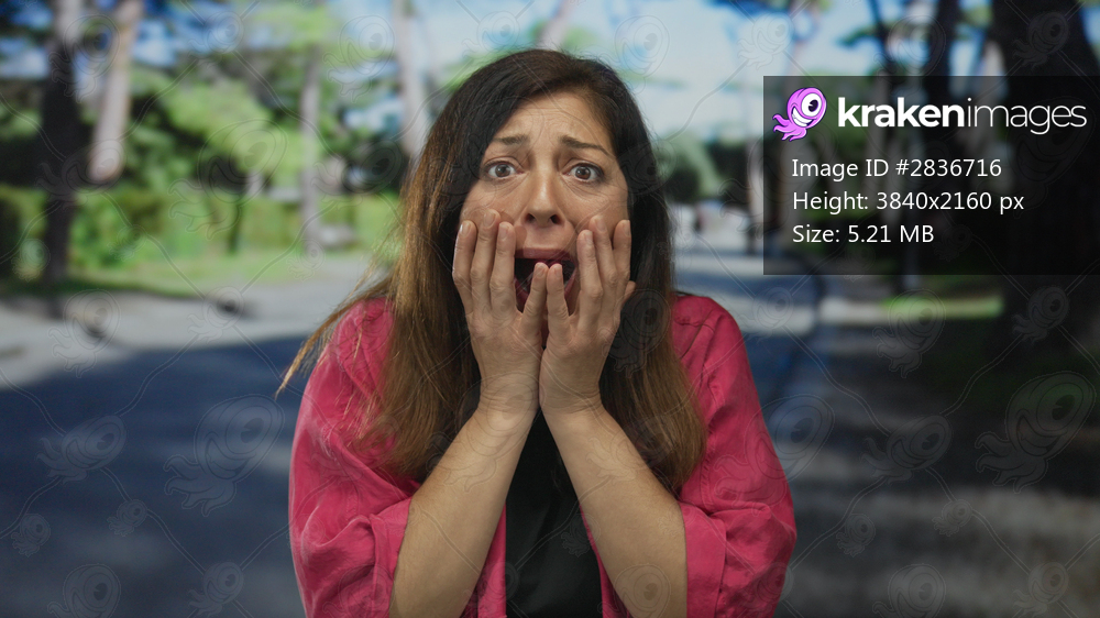 Middle aged hispanic woman pressing cheek with both hands by green trees along paved walkway in park; fear.
