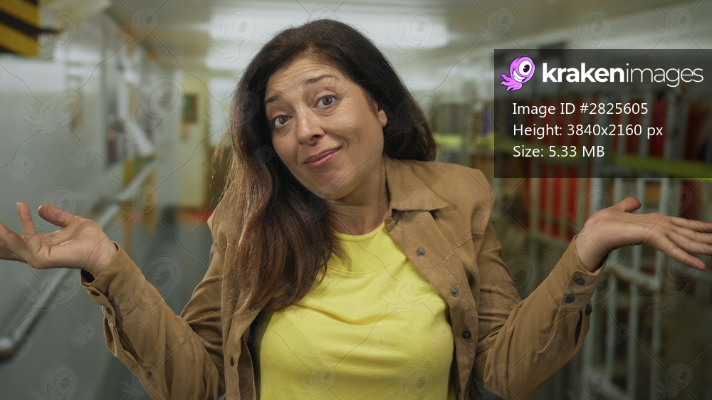 Middle-aged hispanic woman with raised hands shrug gesture in brightly lit corridor inside building; uncertainty.
