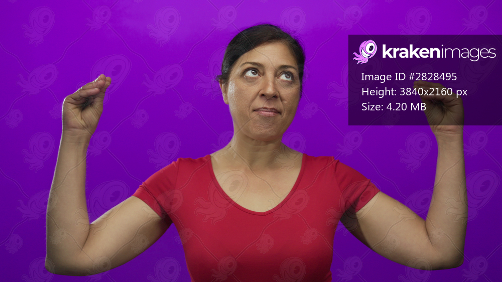 Middle aged hispanic woman with raised hands and tongue out glancing upward in purple studio; curiosity.