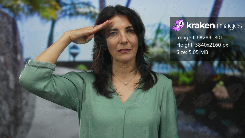 Middle aged hispanic woman raises hand to forehead in forest clearing with palm trunks and lush foliage; respect.
