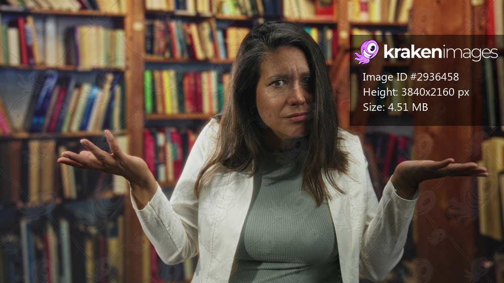 Middle aged hispanic woman showing hands open palms up in a puzzled shrug and slight frown amid bookshelves in a library building; confusion.