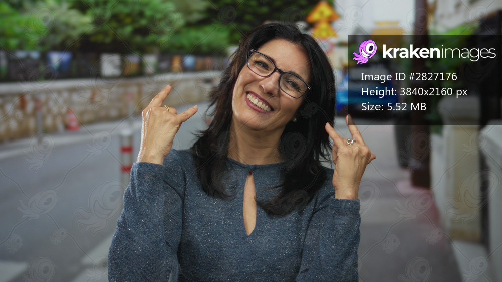 Middle aged hispanic woman shows rock horns gesture with both hands on city street in broad daylight; excitement.
