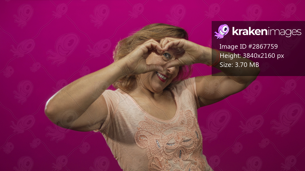 Middle aged hispanic woman smiles broadly and forms heart shape with fingers in vibrant pink studio; love.