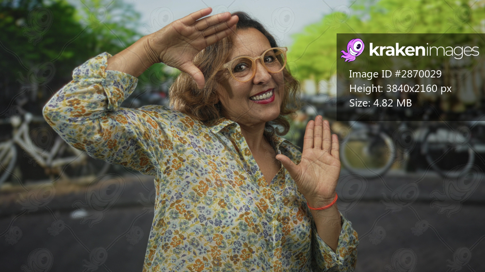 Middle aged hispanic woman smiling framing canal water in amsterdam with hands on street; creative joy.