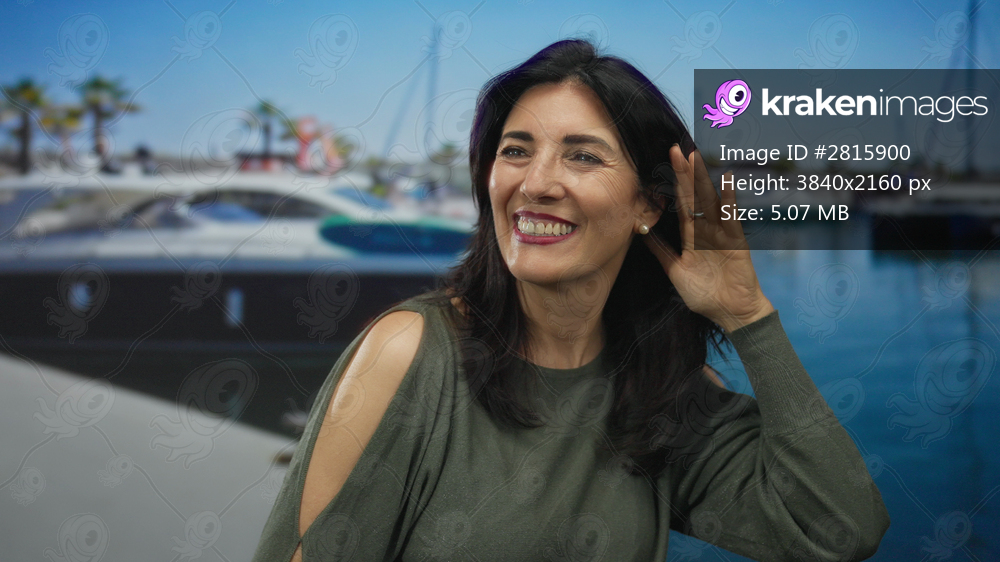 Middle aged hispanic woman smiling and holding hand to ear at a sunny seaside port with a docked boat; happiness.