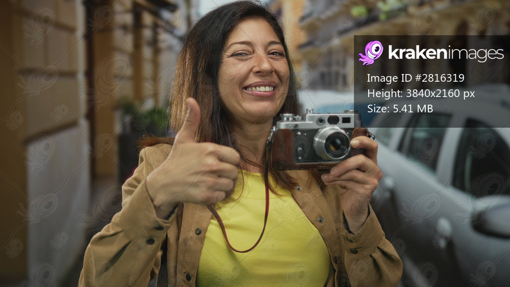 Middle aged hispanic woman smiling and holding vintage camera shows thumbs up on city street near parked cars; approval.